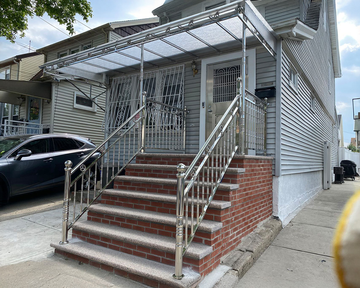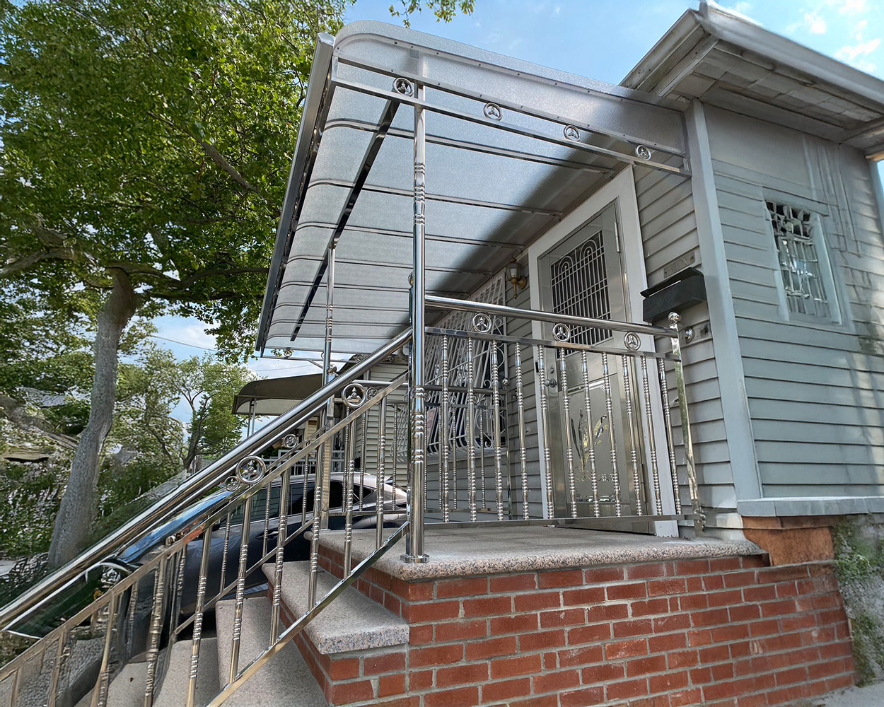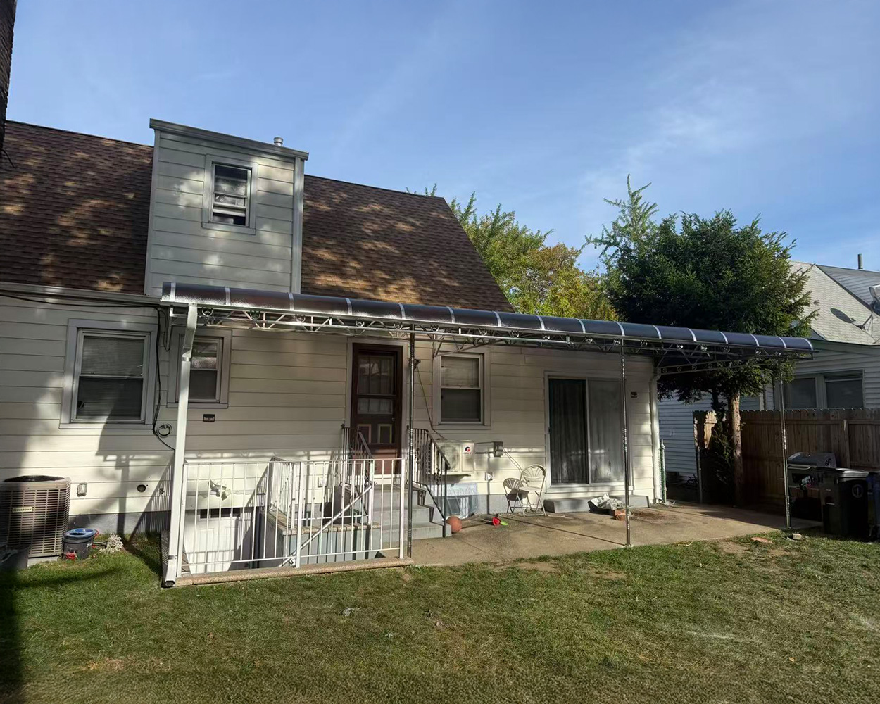 This New York-area home needed reliable all-weather coverage across a long side driveway/walkway and improved protection at the main entry. Based on the photos and the site layout, we confirmed the required span, column positions, and clearance for daily access, then custom-built a powder coated stainless steel canopy system with arched supports and durable tinted panels to keep the space bright while blocking rain and harsh sun. After delivery, the crew set anchor points, installed the posts and main frames, aligned the curved panel sections, and sealed all connections to ensure stable drainage and long-term outdoor performance. The finished canopy adds continuous shelter for parking and passage, keeps doors and steps drier, and gives the property a cleaner, more upgraded exterior look that matches the brick façade.