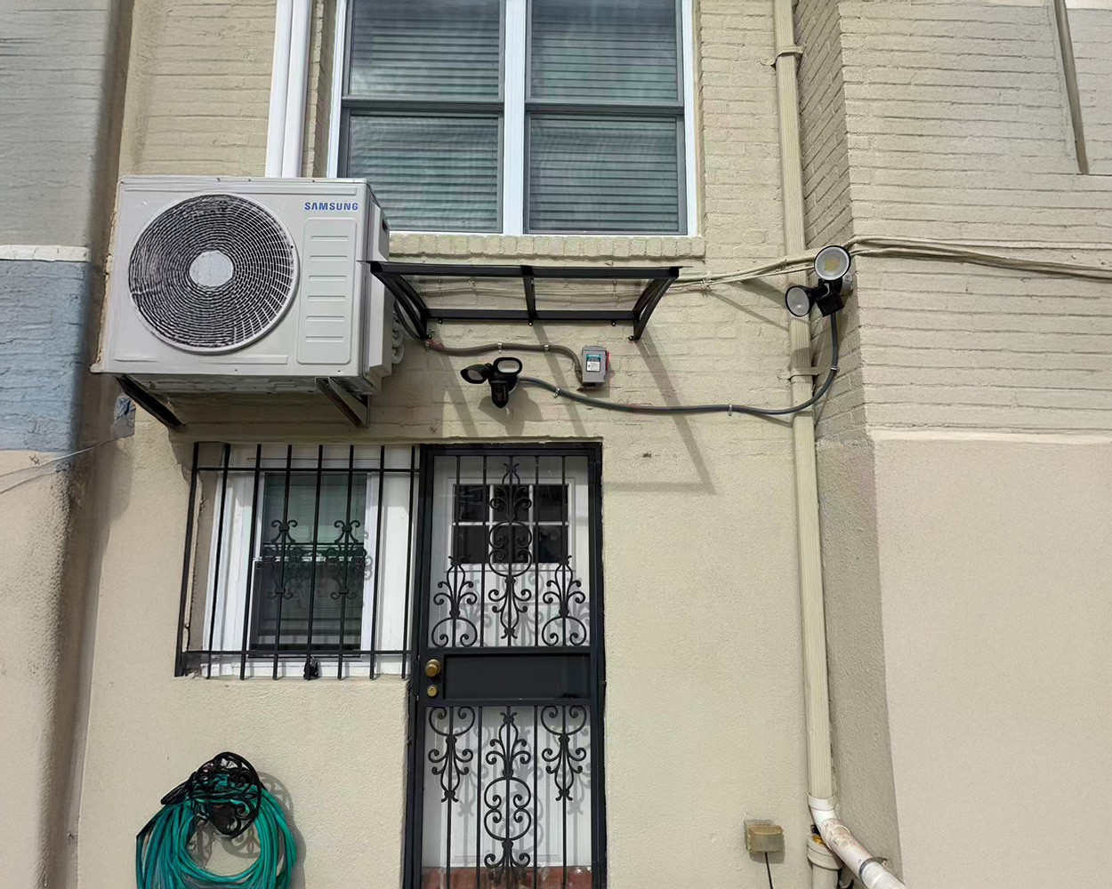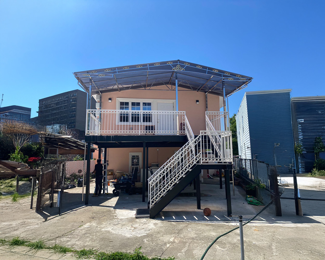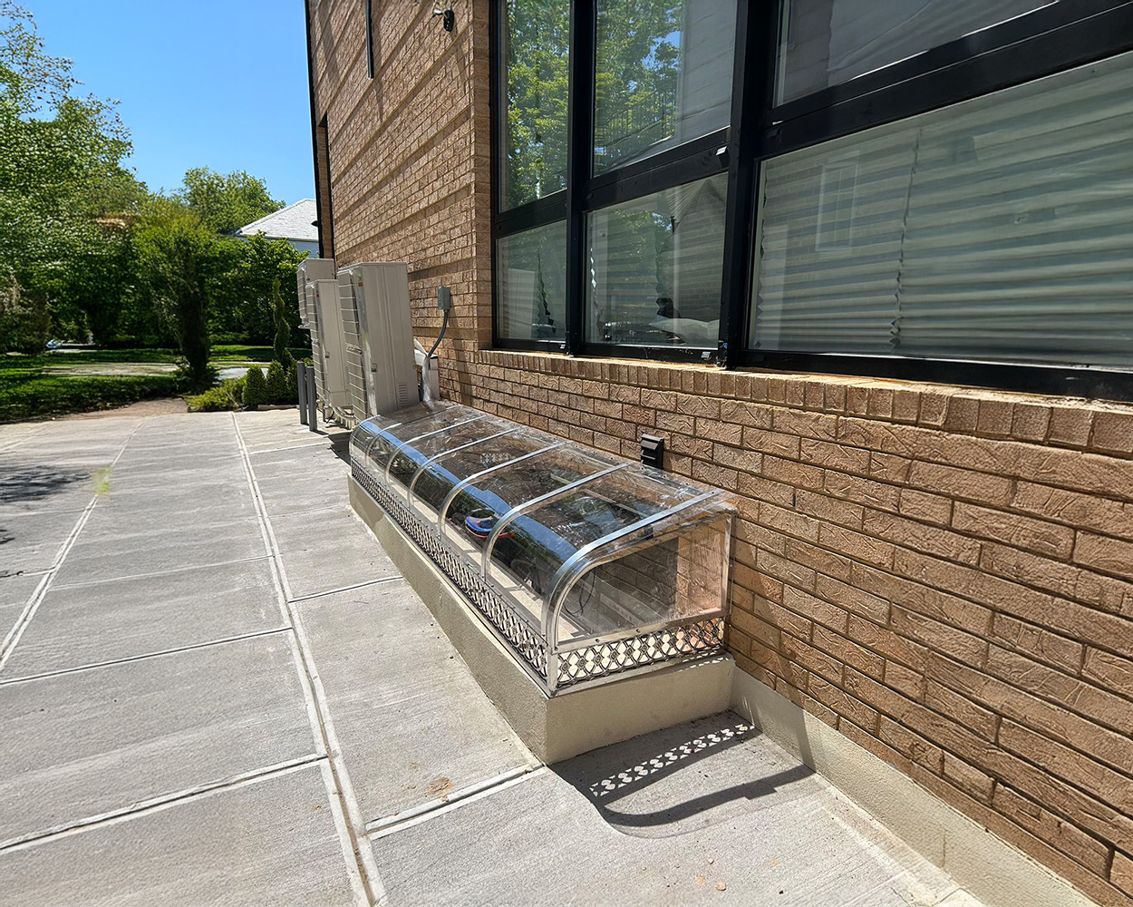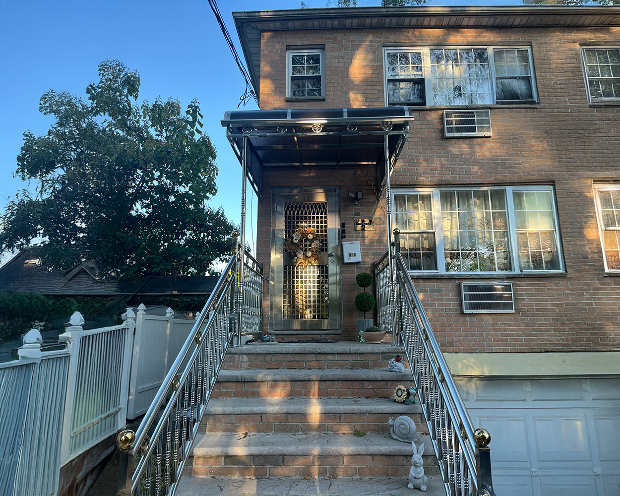 This New York-area home needed reliable all-weather coverage across a long side driveway/walkway and improved protection at the main entry. Based on the photos and the site layout, we confirmed the required span, column positions, and clearance for daily access, then custom-built a powder coated stainless steel canopy system with arched supports and durable tinted panels to keep the space bright while blocking rain and harsh sun. After delivery, the crew set anchor points, installed the posts and main frames, aligned the curved panel sections, and sealed all connections to ensure stable drainage and long-term outdoor performance. The finished canopy adds continuous shelter for parking and passage, keeps doors and steps drier, and gives the property a cleaner, more upgraded exterior look that matches the brick façade.