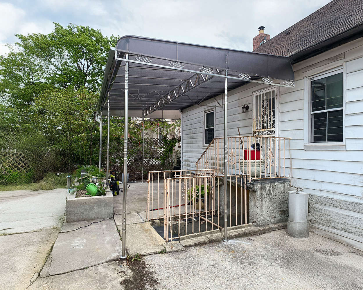 We delivered an extra-long stainless steel structure with reinforced truss bracing and smoke polycarbonate roofing for UV protection and glare control. The posts were anchored with base plates for stability, and the clean, linear profile keeps the home’s façade simple while improving rain and snow protection across the full span.