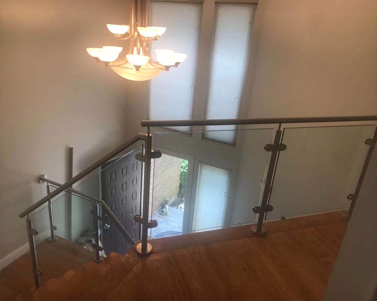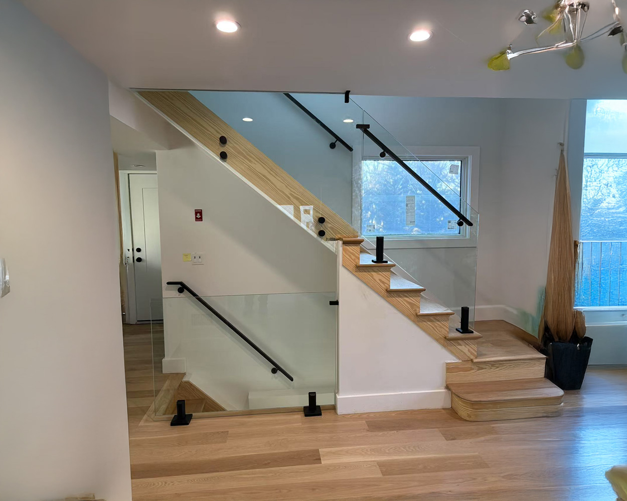 This Chelsea renovation needed a clean, modern safety solution for an open staircase and second-floor loft edge without blocking light or views. We started by confirming on-site dimensions, stair angles, and mounting conditions, then produced shop drawings to lock in panel sizes, bracket positions, and handrail alignment. The system was built with tempered clear glass panels and stainless steel mounting hardware, with select handrail/trim finished in powder coated tones (matte black and champagne-gold accents) to match the interior style. After fabrication, our crew installed the base shoes/standoffs, set and leveled each glass panel, sealed and fine-adjusted all joints, and finished with a final safety check for rigidity, smooth transitions at corners/landings, and consistent sightlines throughout the stair run and mezzanine.