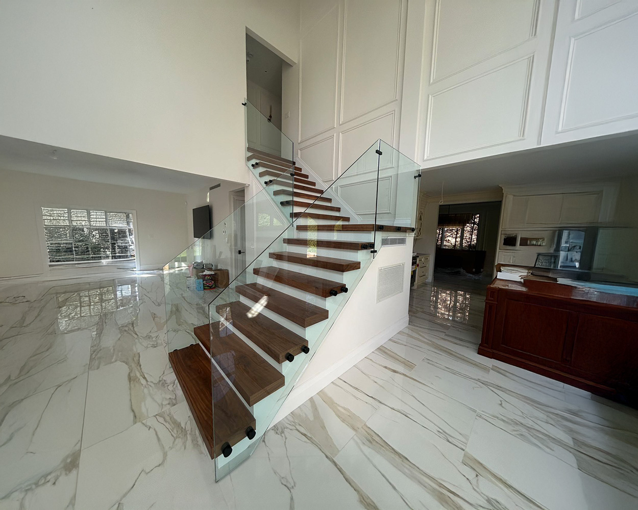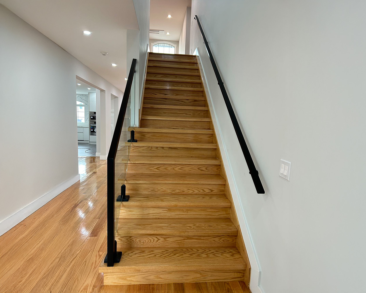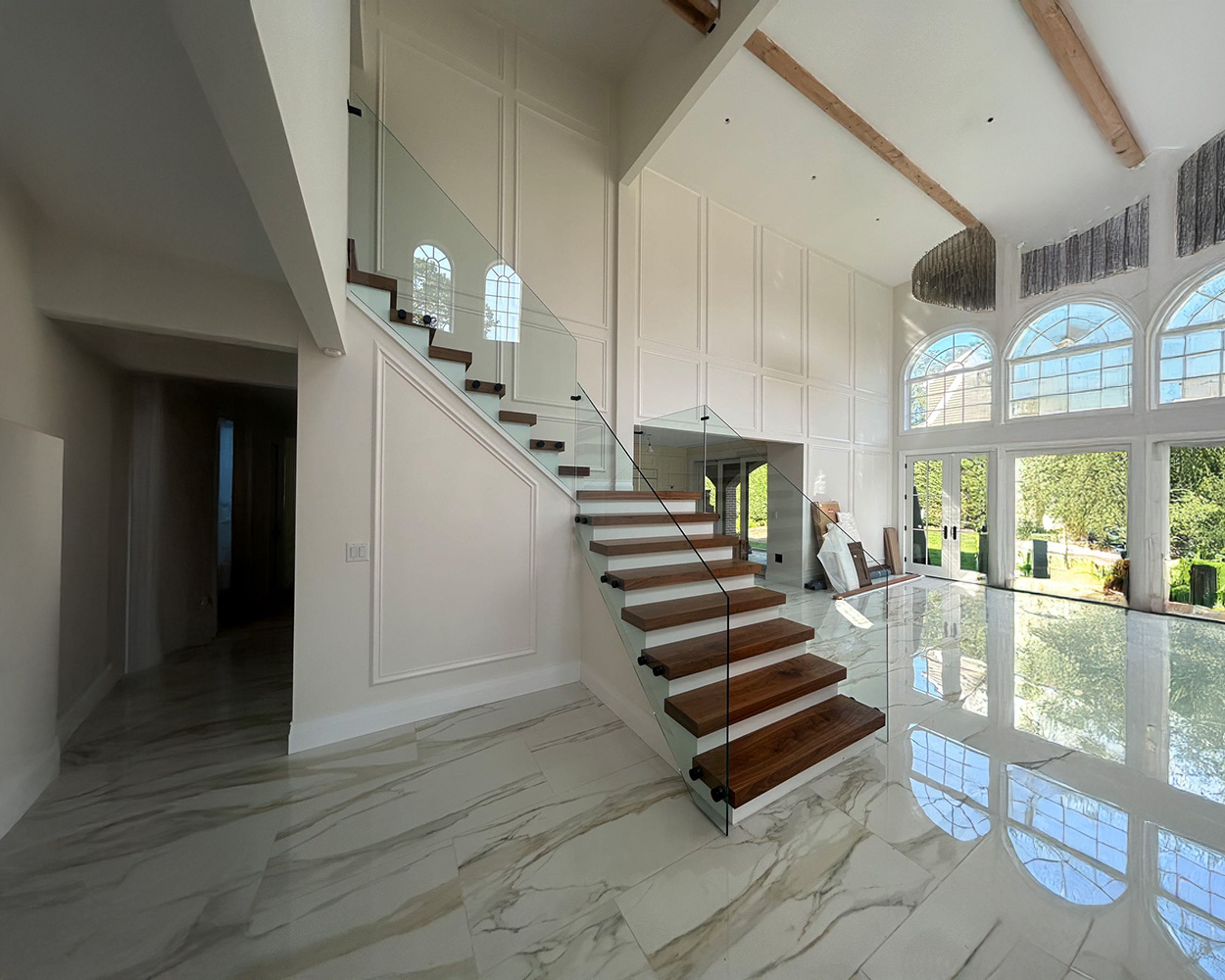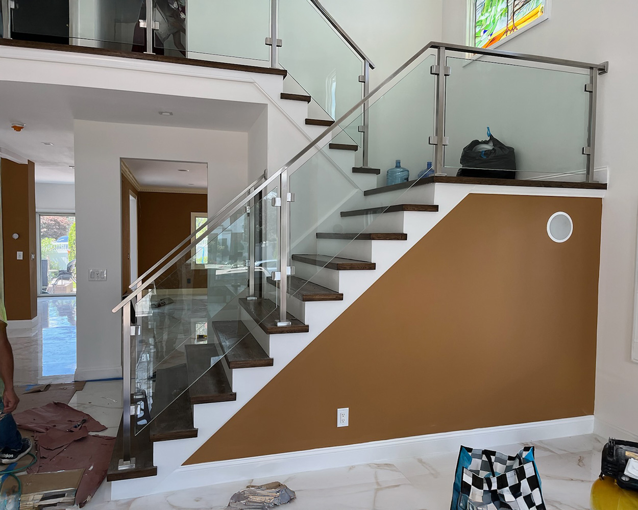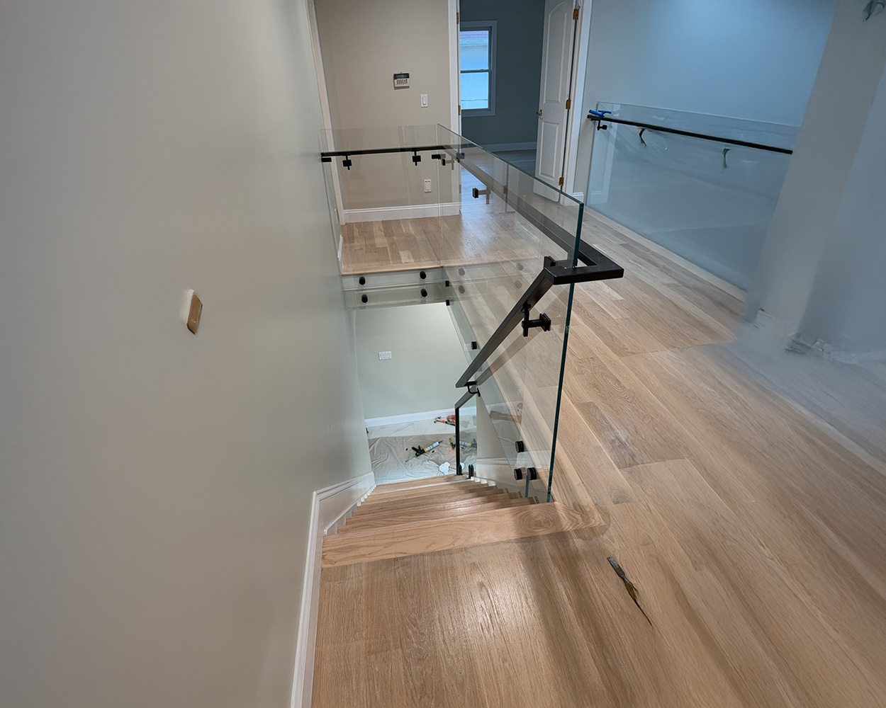 This project was a high-end residential renovation featuring a floating wood staircase and a double-height foyer, where the client wanted a clean, open look without blocking the light from the tall arched windows. We measured the stair run, landing, and second-floor overlook, then fabricated stainless steel railing structures with a powder coated matte-black finish to match the home’s modern trim details. After confirming the final glass sizes on-site, we installed the posts and mounting hardware, set the tempered glass panels with precise alignment, and completed a final safety check on spacing, rigidity, and edge protection. The finished result delivers a sleek “invisible” barrier effect, keeps the space bright and airy, and provides solid, code-conscious protection along both the staircase and the upstairs balcony.
