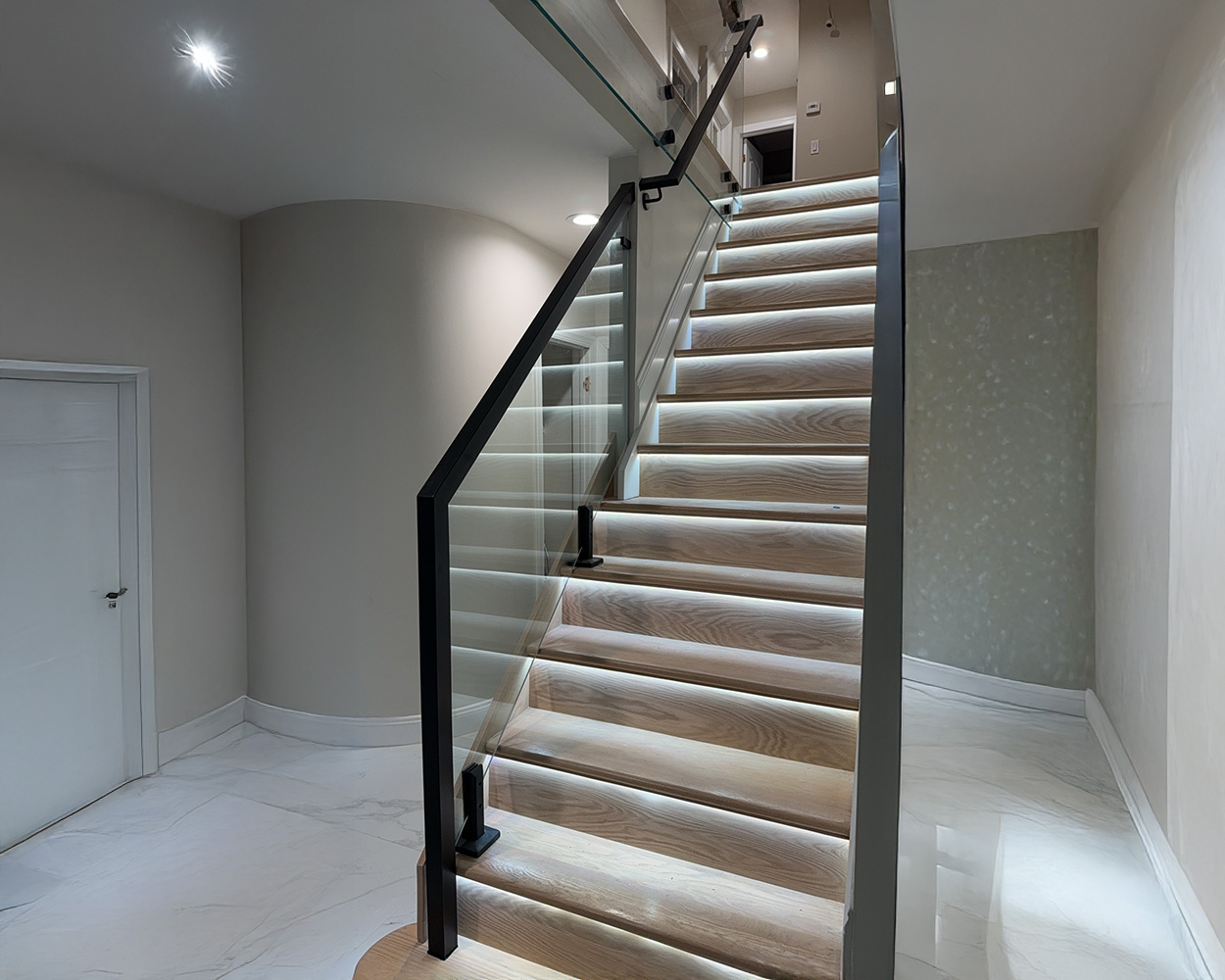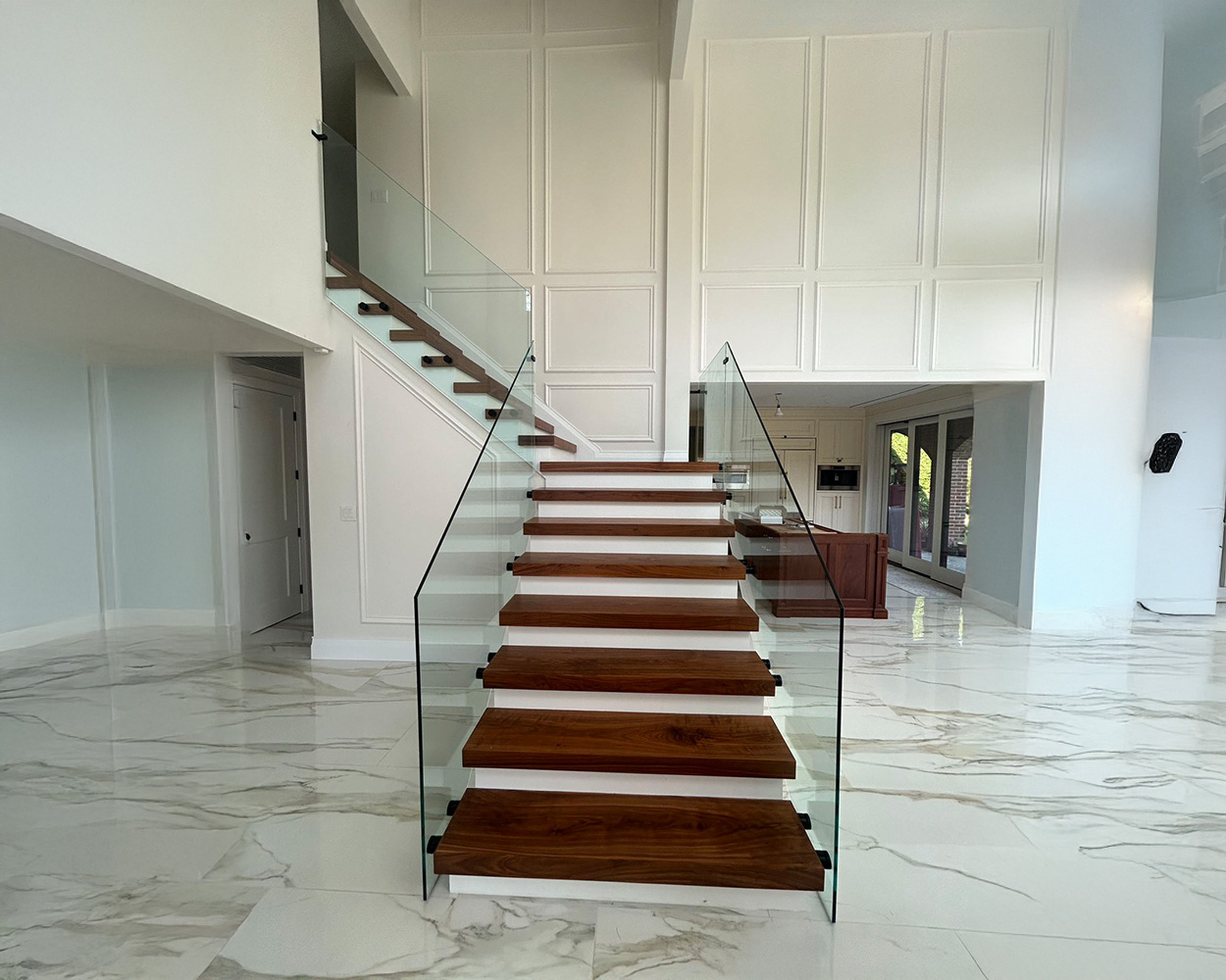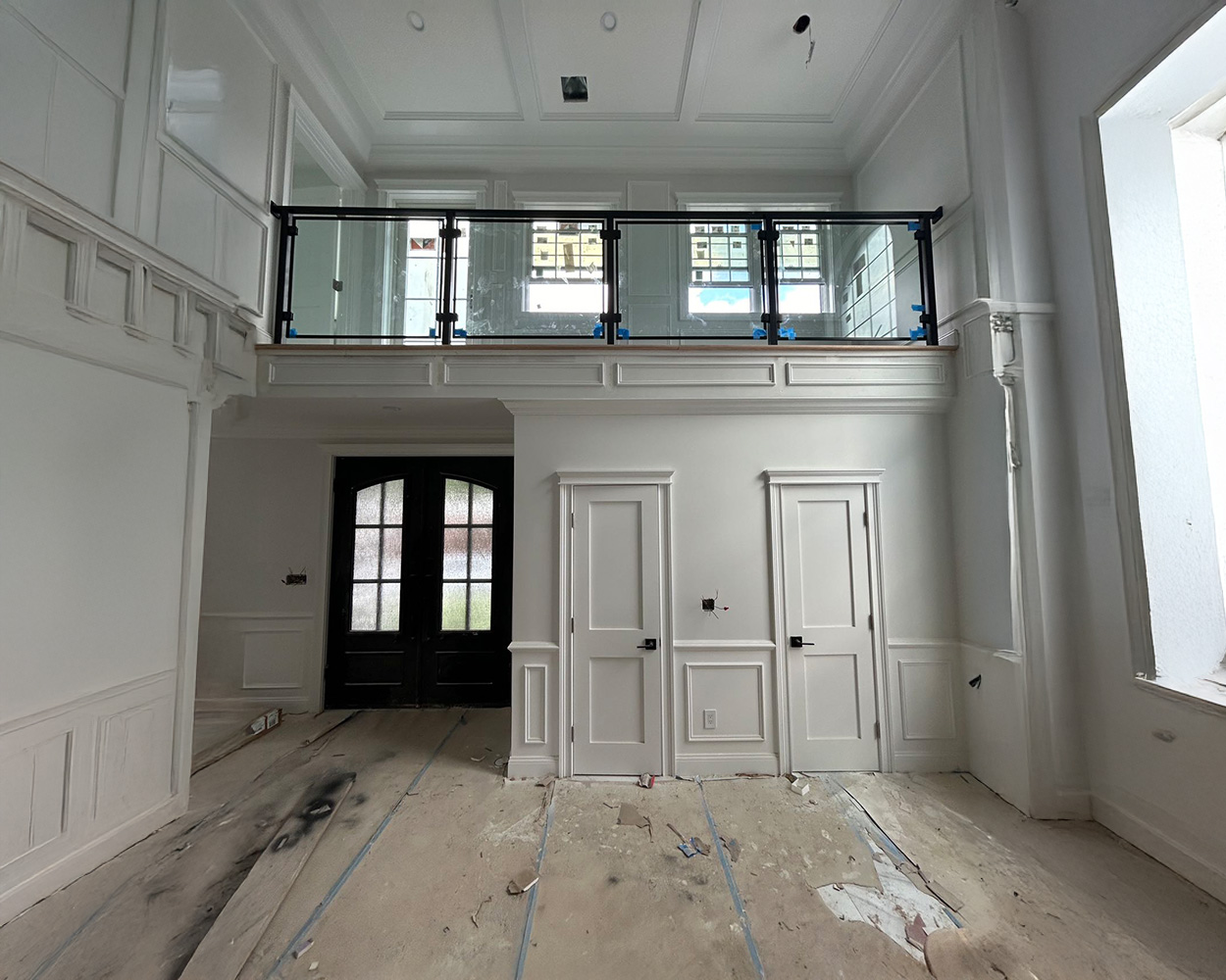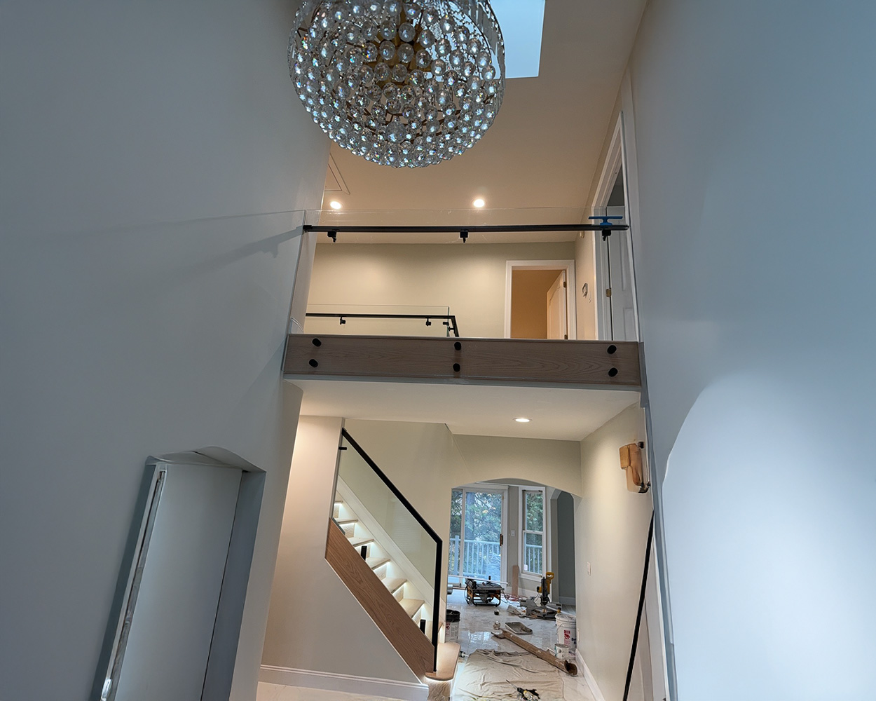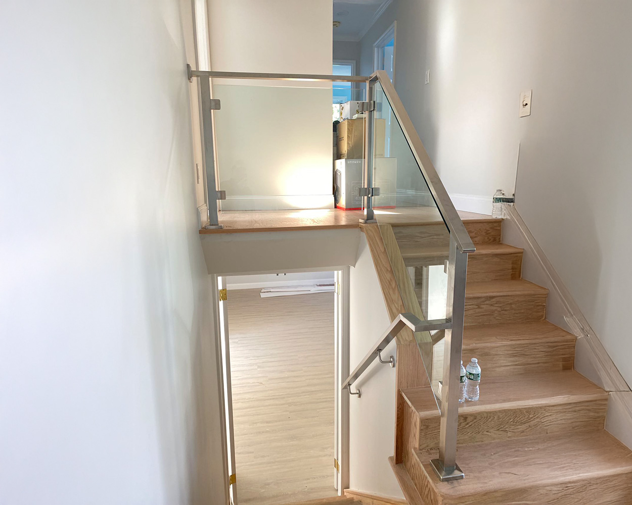 This project was a high-end residential renovation featuring a floating wood staircase and a double-height foyer, where the client wanted a clean, open look without blocking the light from the tall arched windows. We measured the stair run, landing, and second-floor overlook, then fabricated stainless steel railing structures with a powder coated matte-black finish to match the home’s modern trim details. After confirming the final glass sizes on-site, we installed the posts and mounting hardware, set the tempered glass panels with precise alignment, and completed a final safety check on spacing, rigidity, and edge protection. The finished result delivers a sleek “invisible” barrier effect, keeps the space bright and airy, and provides solid, code-conscious protection along both the staircase and the upstairs balcony.