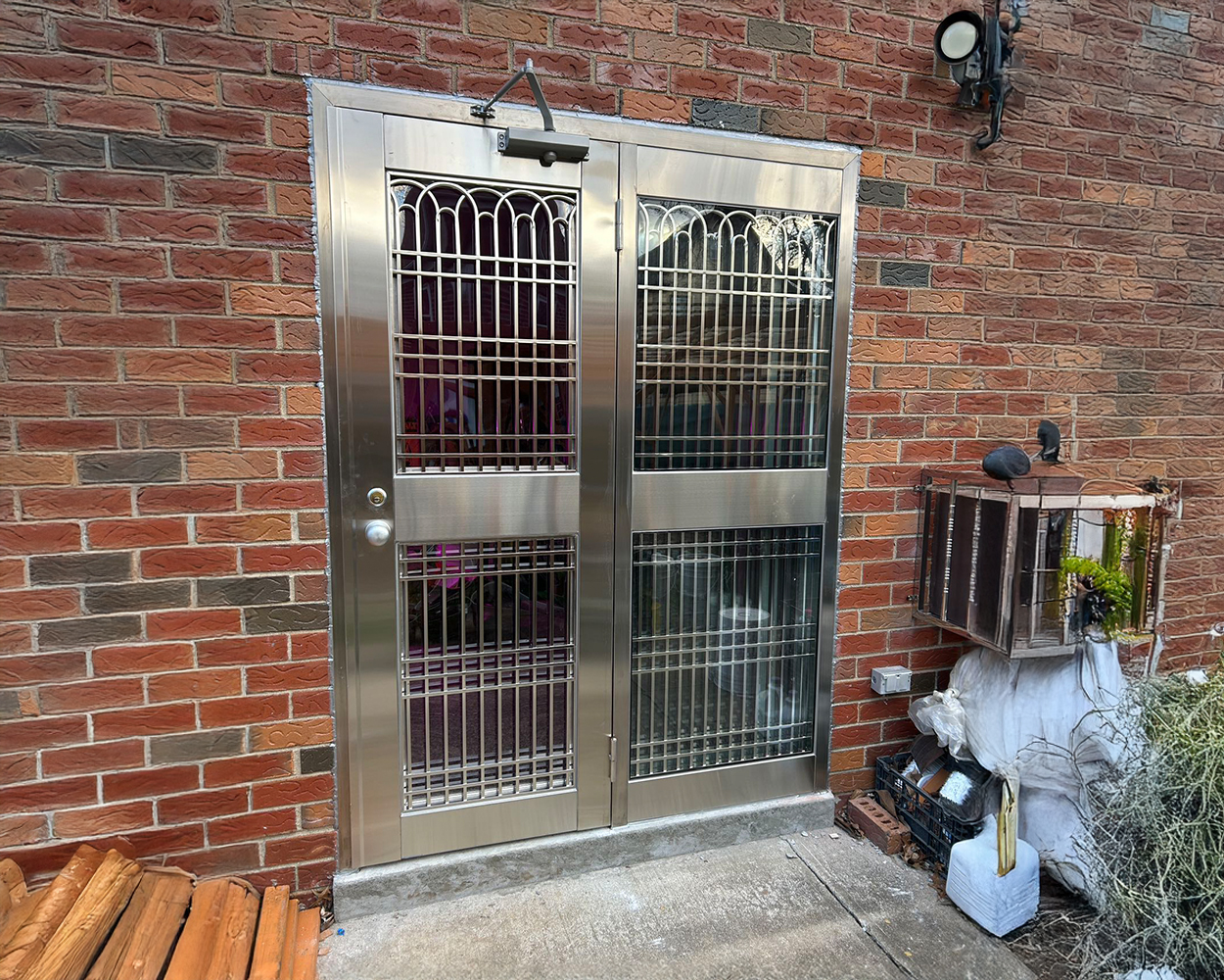 Custom Stainless Steel Security Doors, Double-Entry Systems & Window Guards (Brushed Stainless Finish)