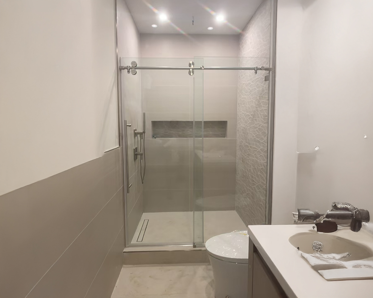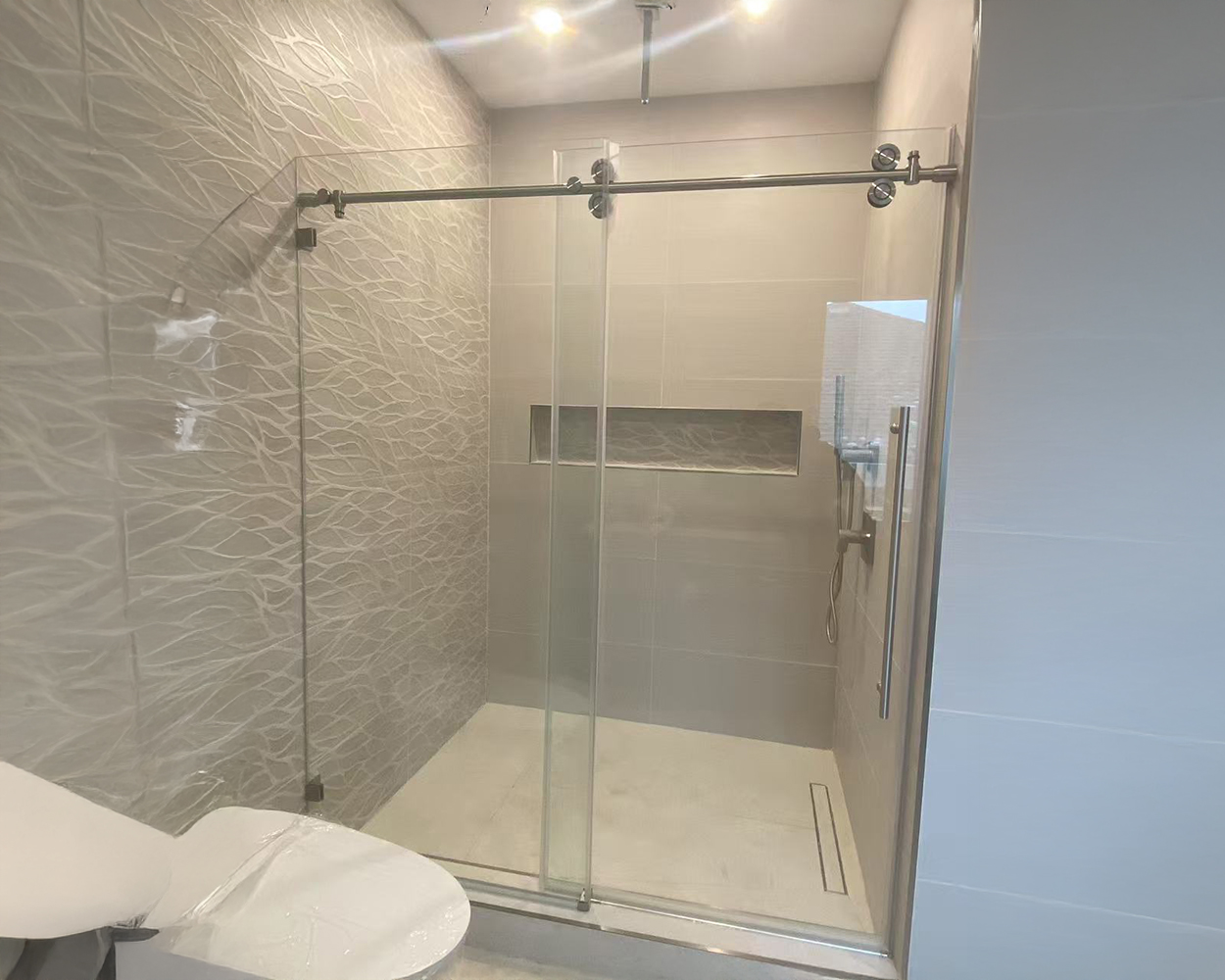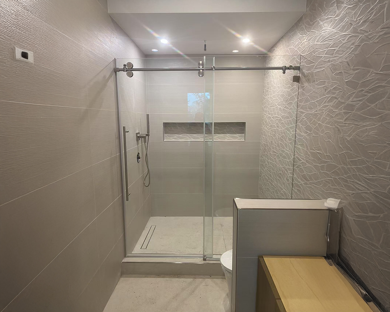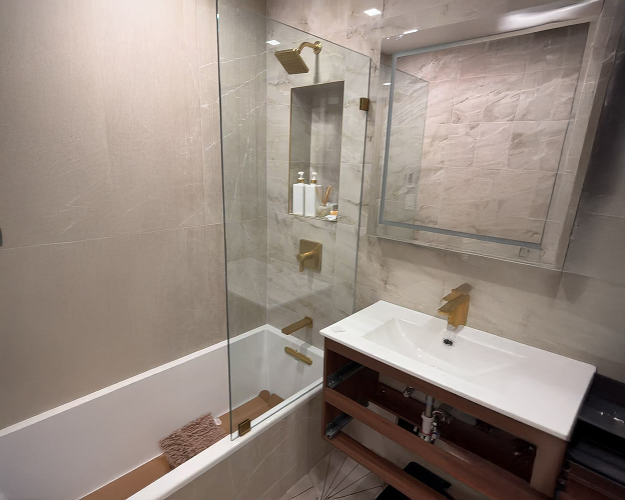 This project was part of a NYC-area apartment bathroom refresh where the homeowner wanted clean, modern glass enclosures that would visually match the updated fixtures and tile work across multiple shower layouts. Based on the on-site measurements and wall conditions, we provided a coordinated set of tempered glass solutions, including a tub-shower glass screen and sliding door configurations, plus a frameless walk-in/corner style enclosure where needed. Because the visible hardware finish is not stainless steel original color, all metal components were specified as powder-coated stainless steel to achieve the brushed-gold / matte-finish look while keeping corrosion resistance for daily use. After fabrication, the installation team aligned the panels, set the tracks/hinges, adjusted door movement, and sealed the perimeter to control splash and improve long-term watertight performance. The final result is a consistent, high-end bathroom appearance with smoother operation, clearer sightlines, and a more premium “hotel-style” feel.